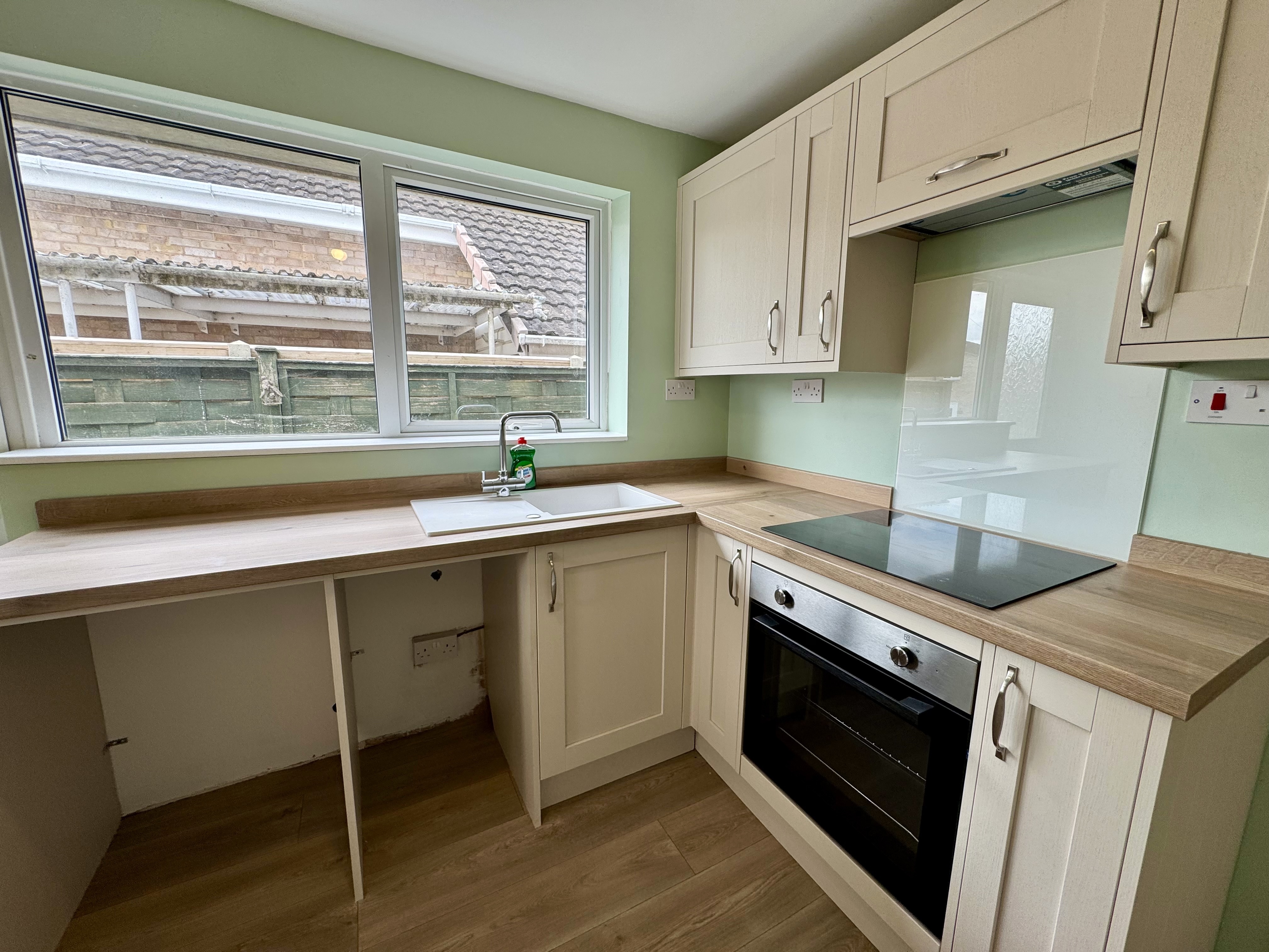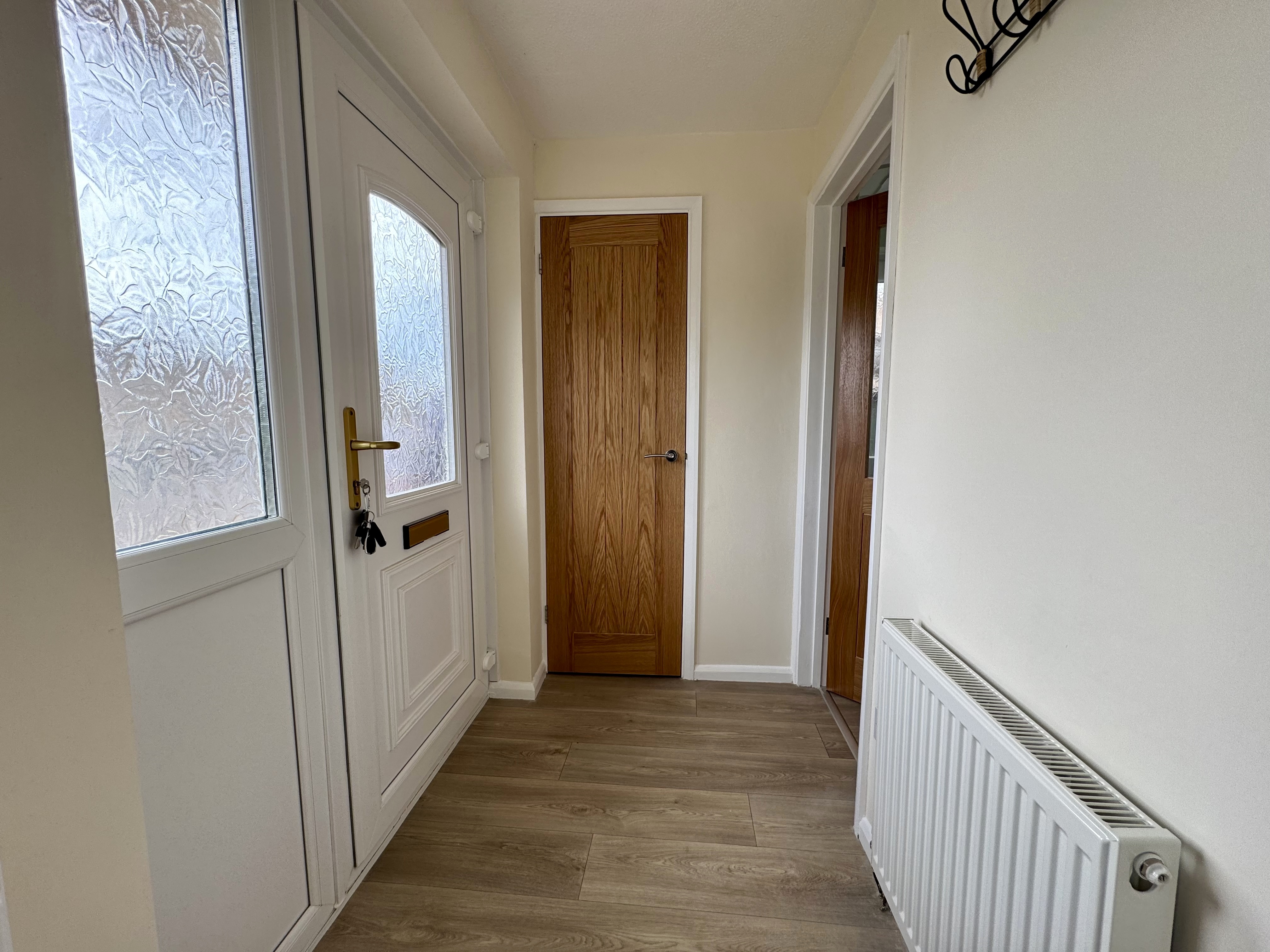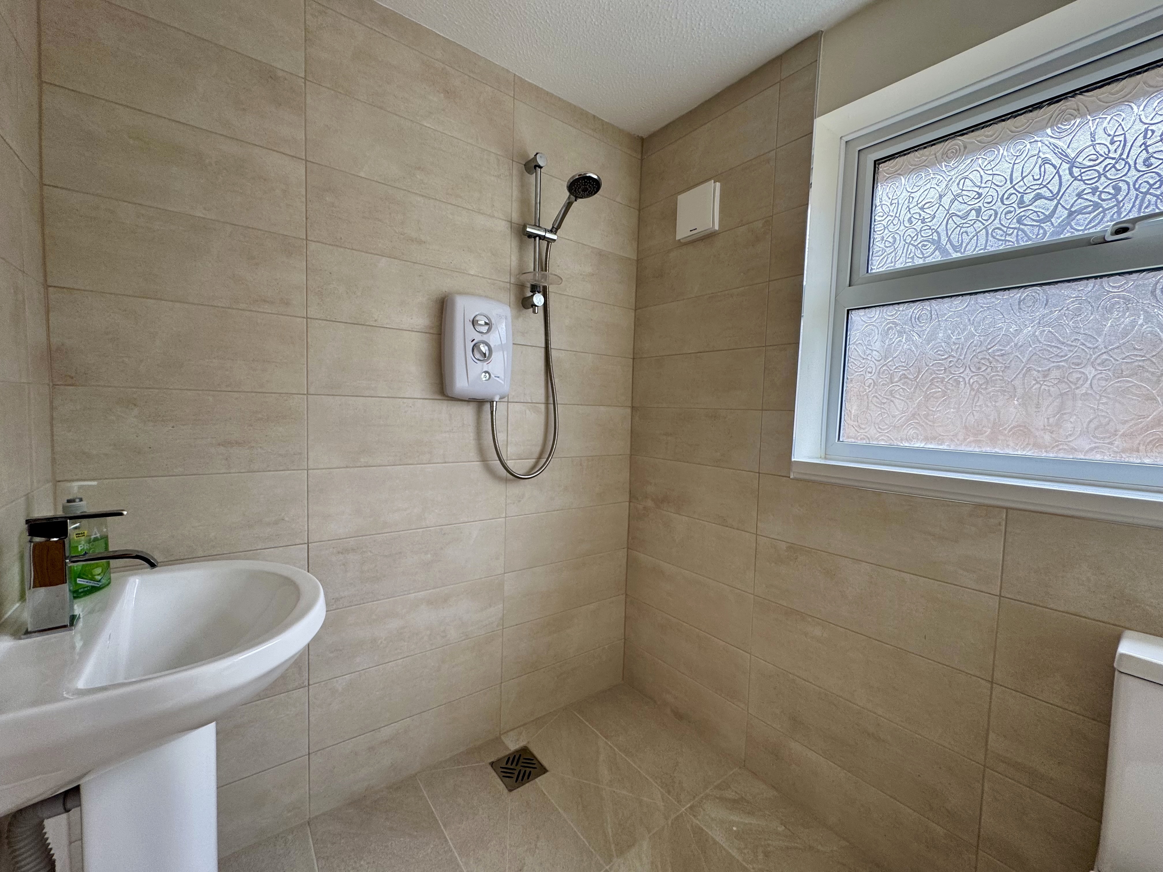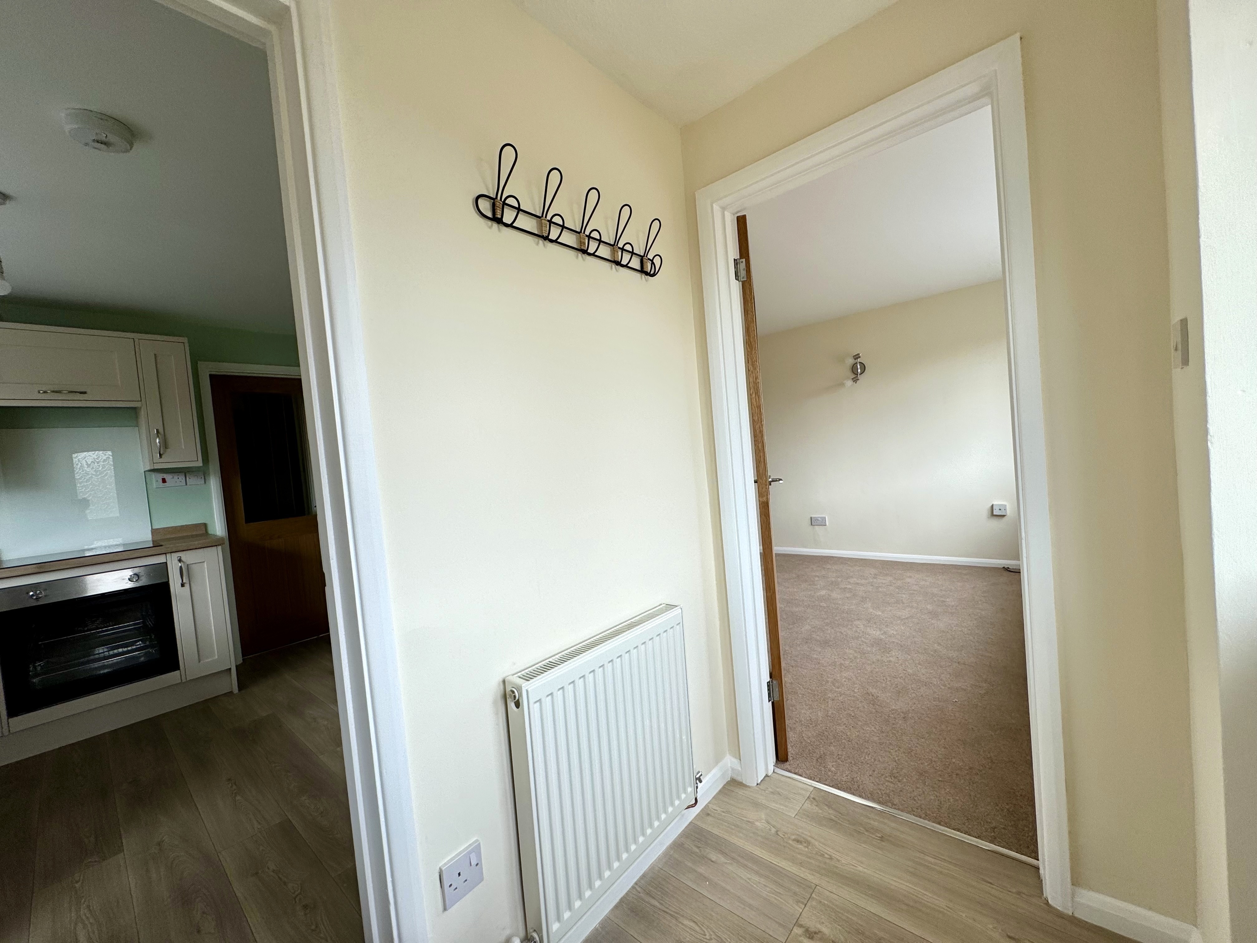 The entrance hall leads into the heart of the home: a generous lounge alongside a well-appointed, recently fitted kitchen with an integrated fridge freezer, cooker, and hob. Two double bedrooms enjoy views over the generous rear garden, and the property benefits from a recently fitted shower/wet room.