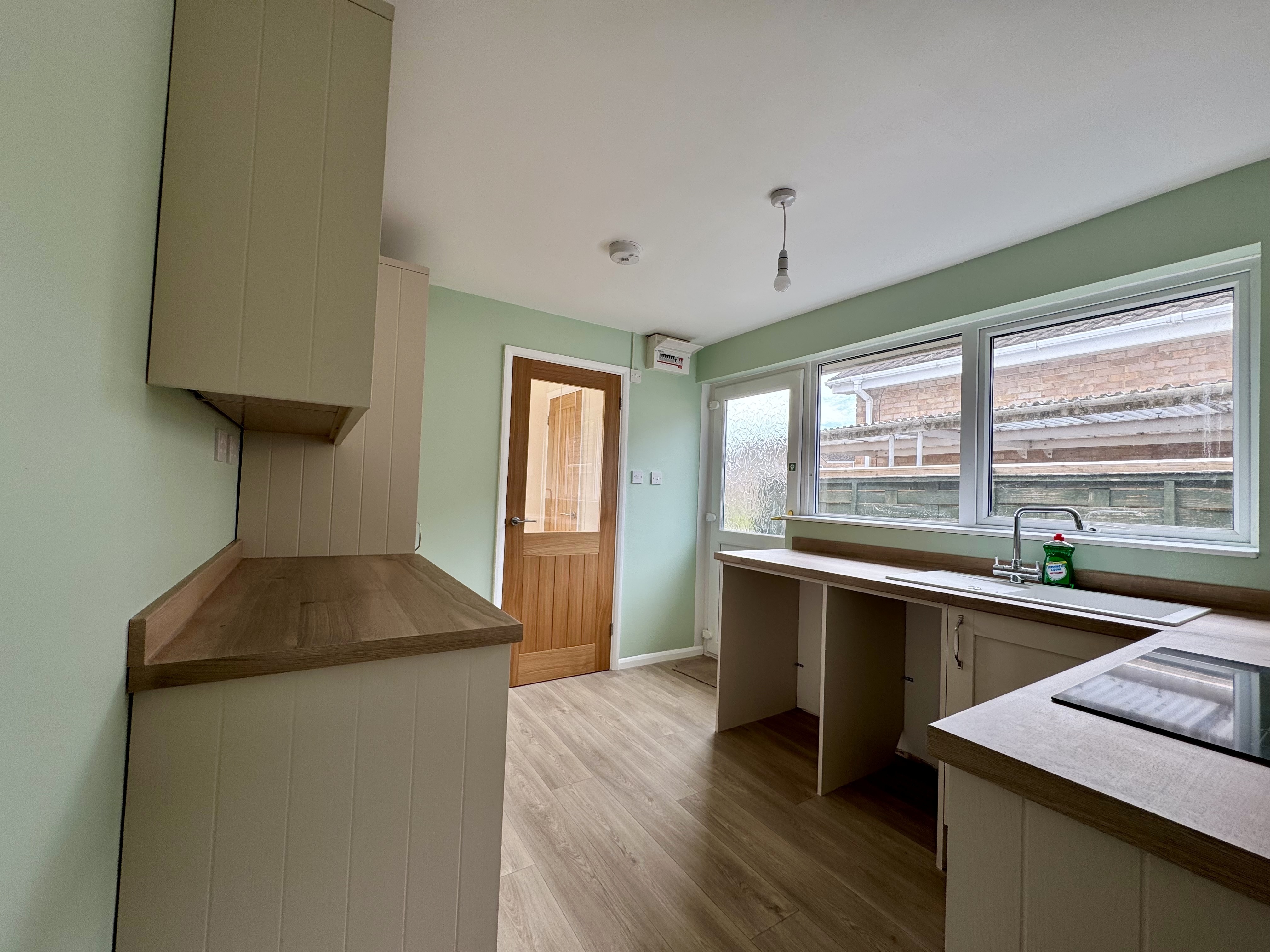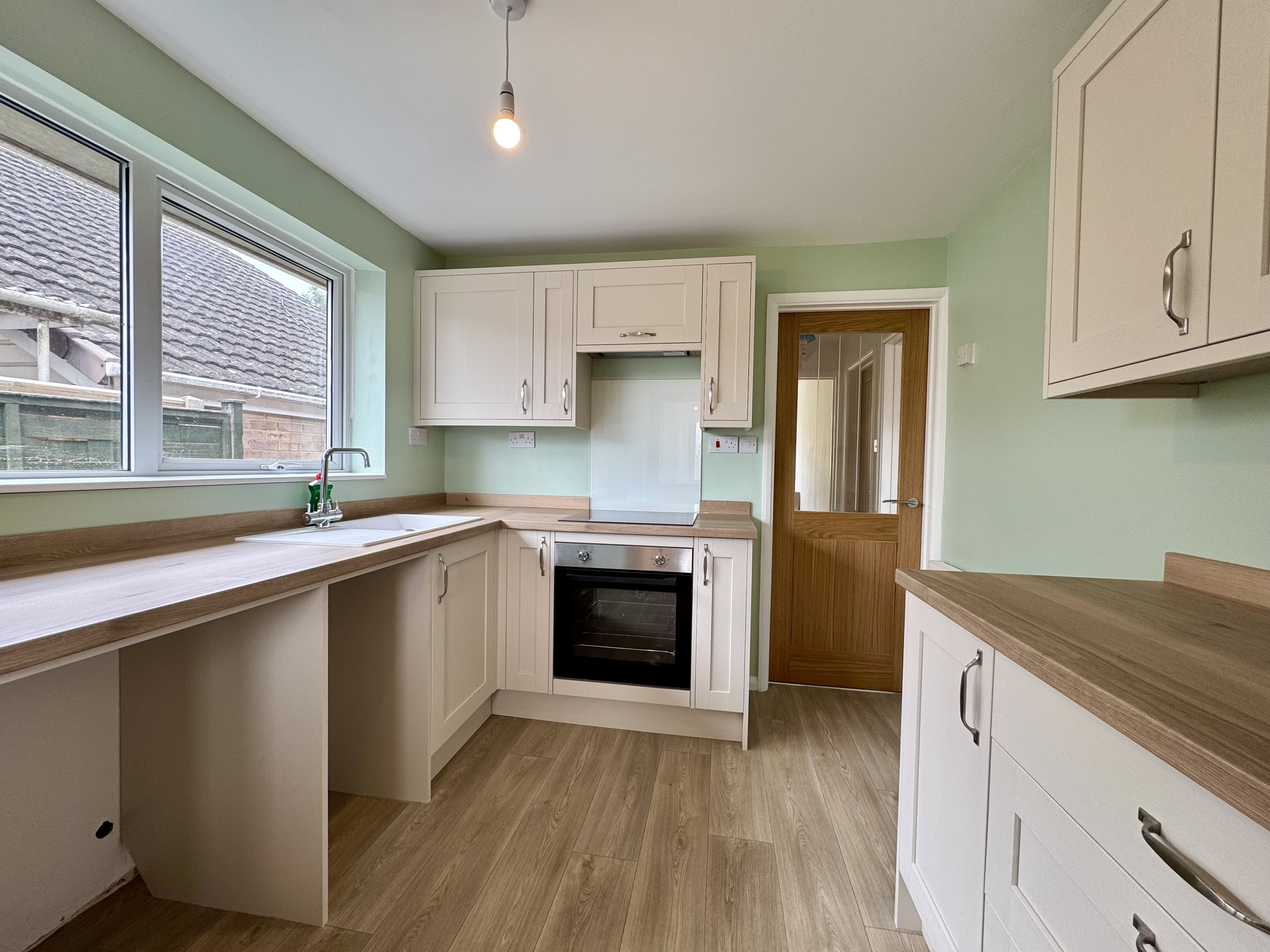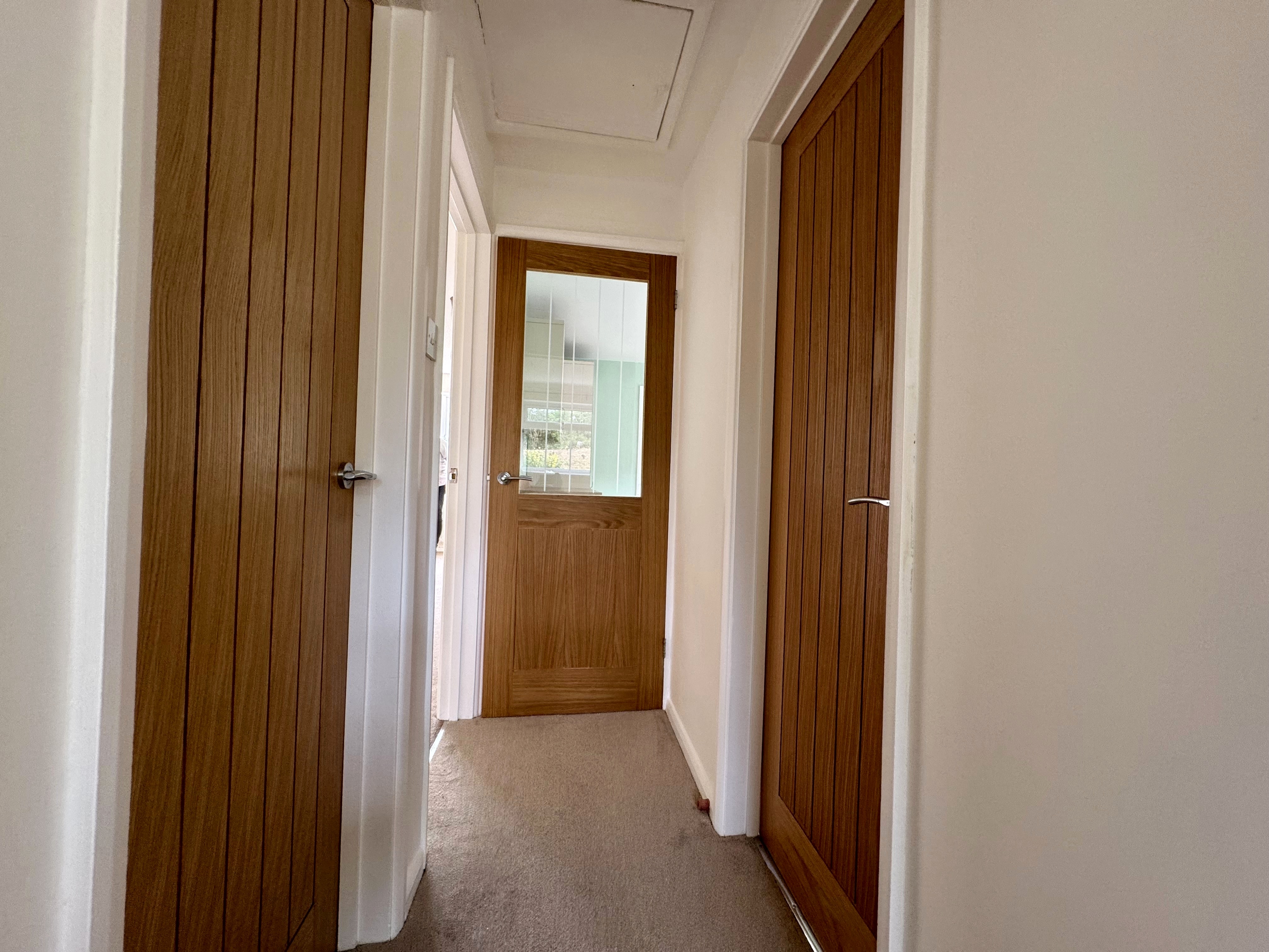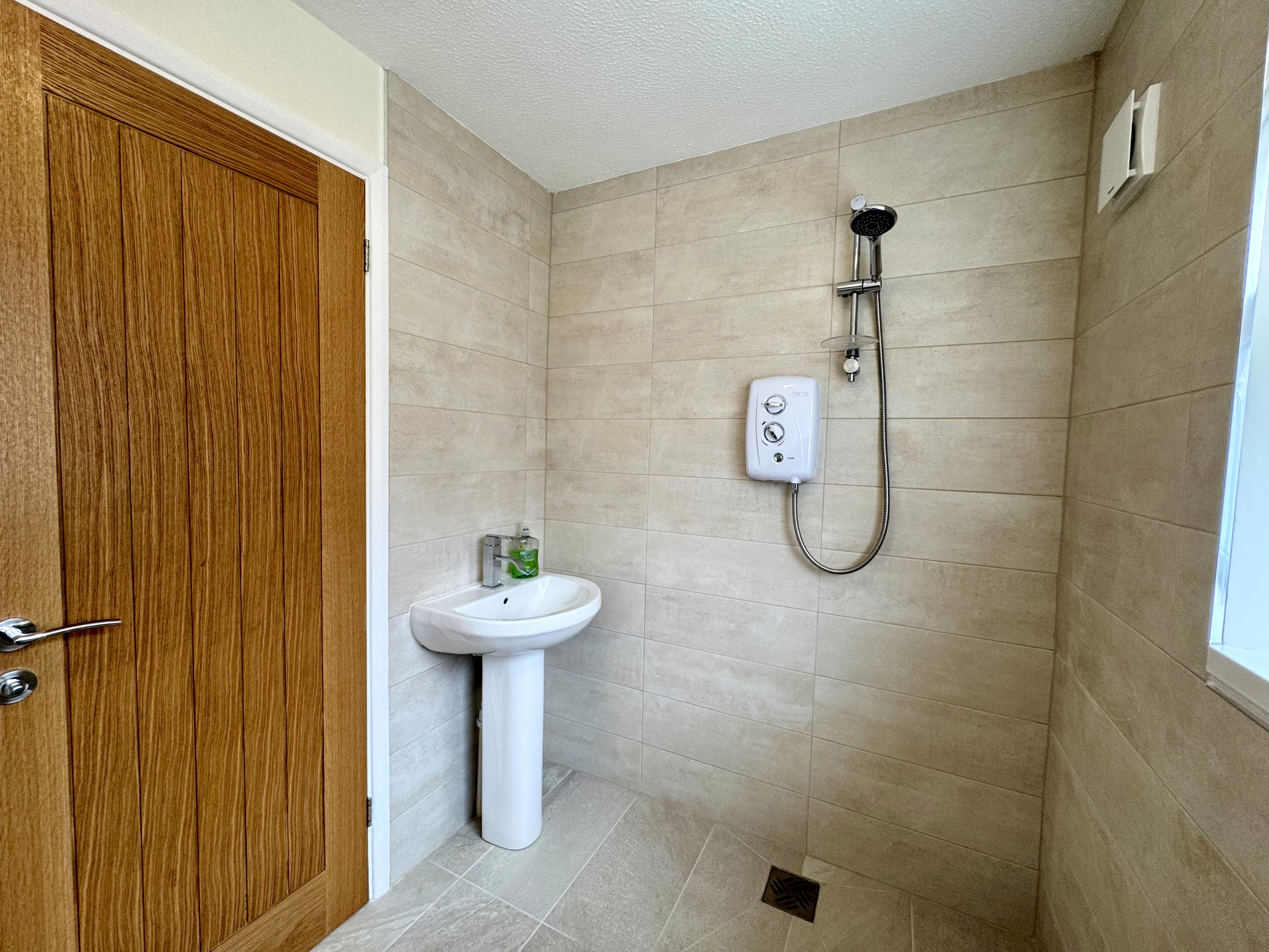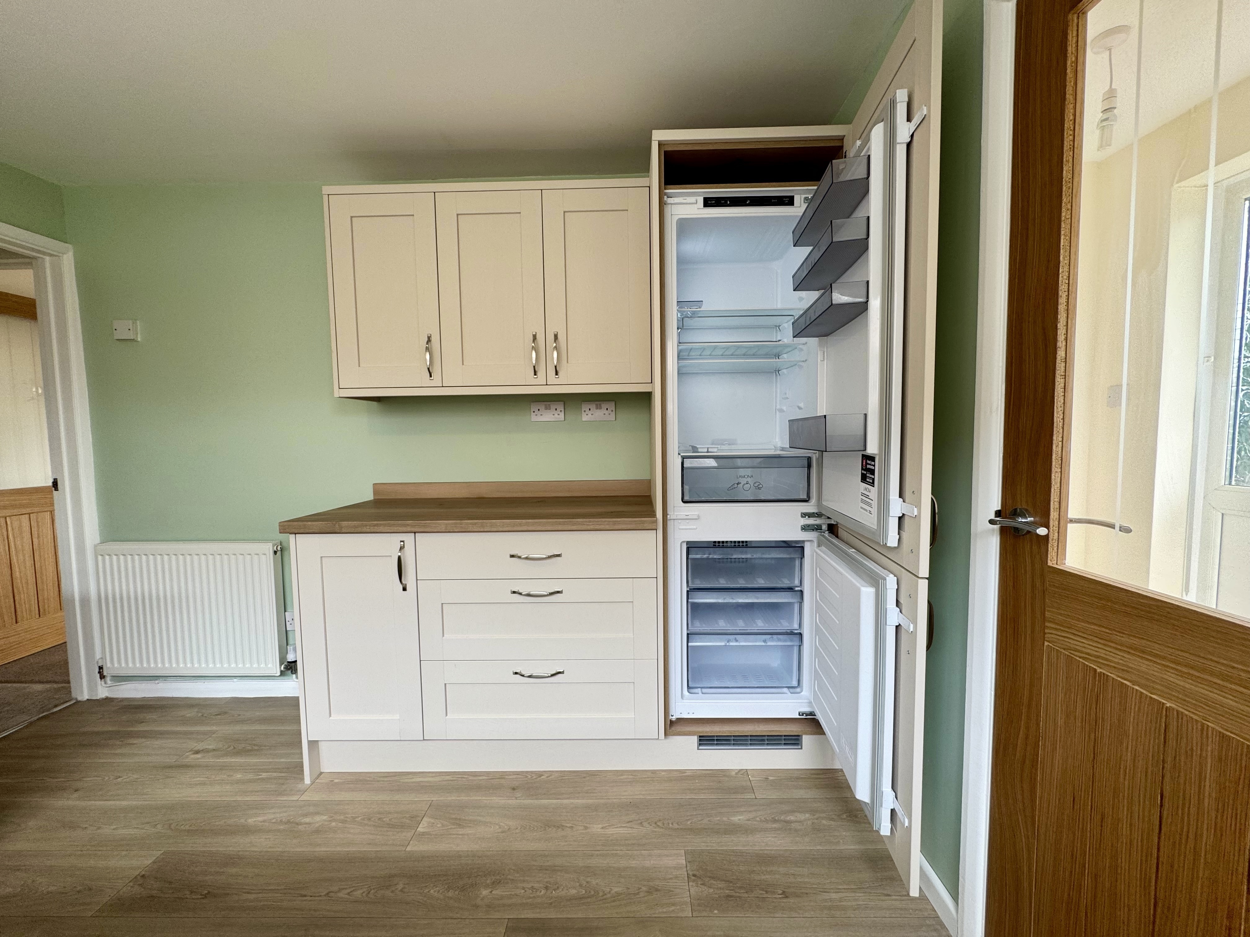 The entrance hall leads into the heart of the home: a generous lounge alongside a well-appointed, recently fitted kitchen with an integrated fridge freezer, cooker, and hob. Two double bedrooms enjoy views over the generous rear garden, and the property benefits from a recently fitted shower/wet room.