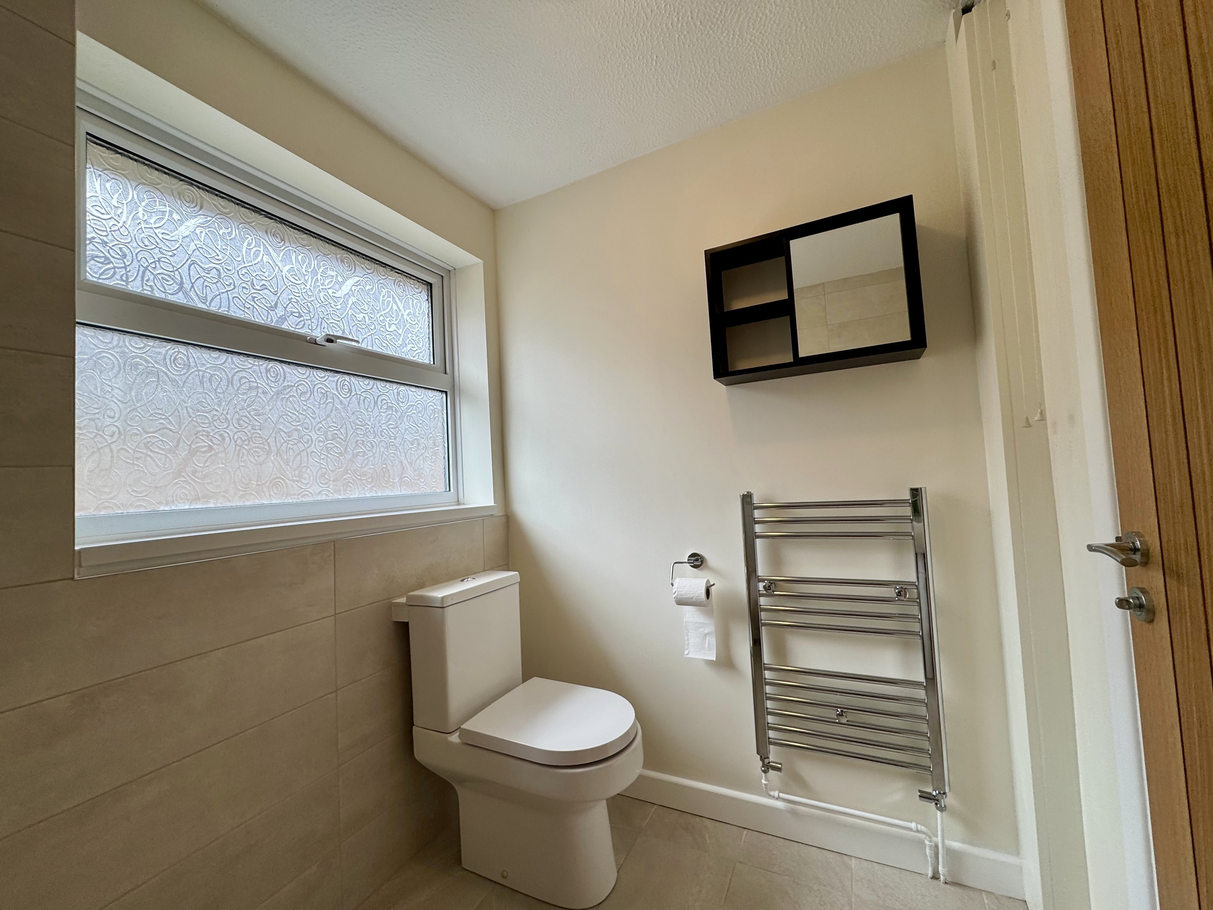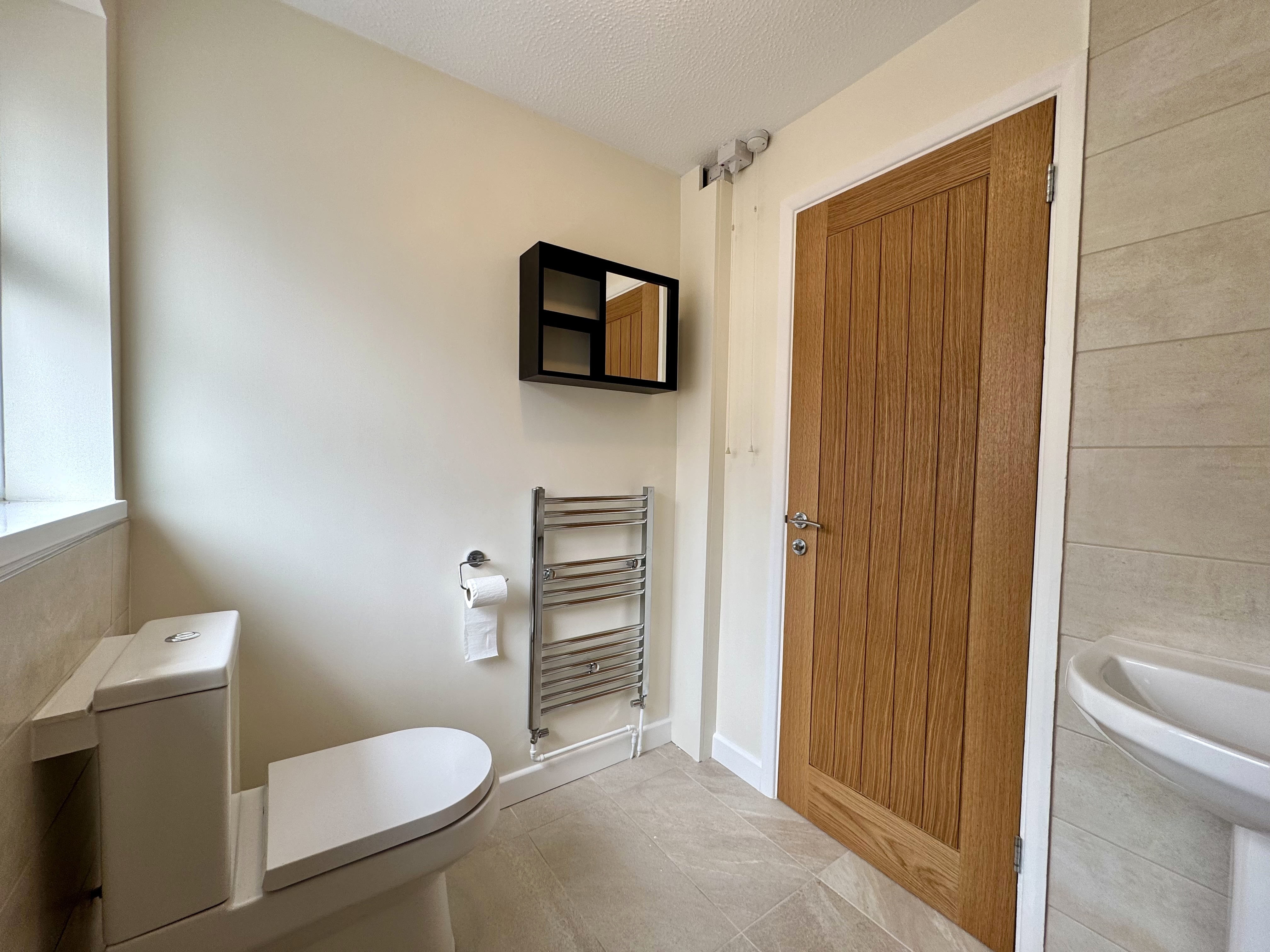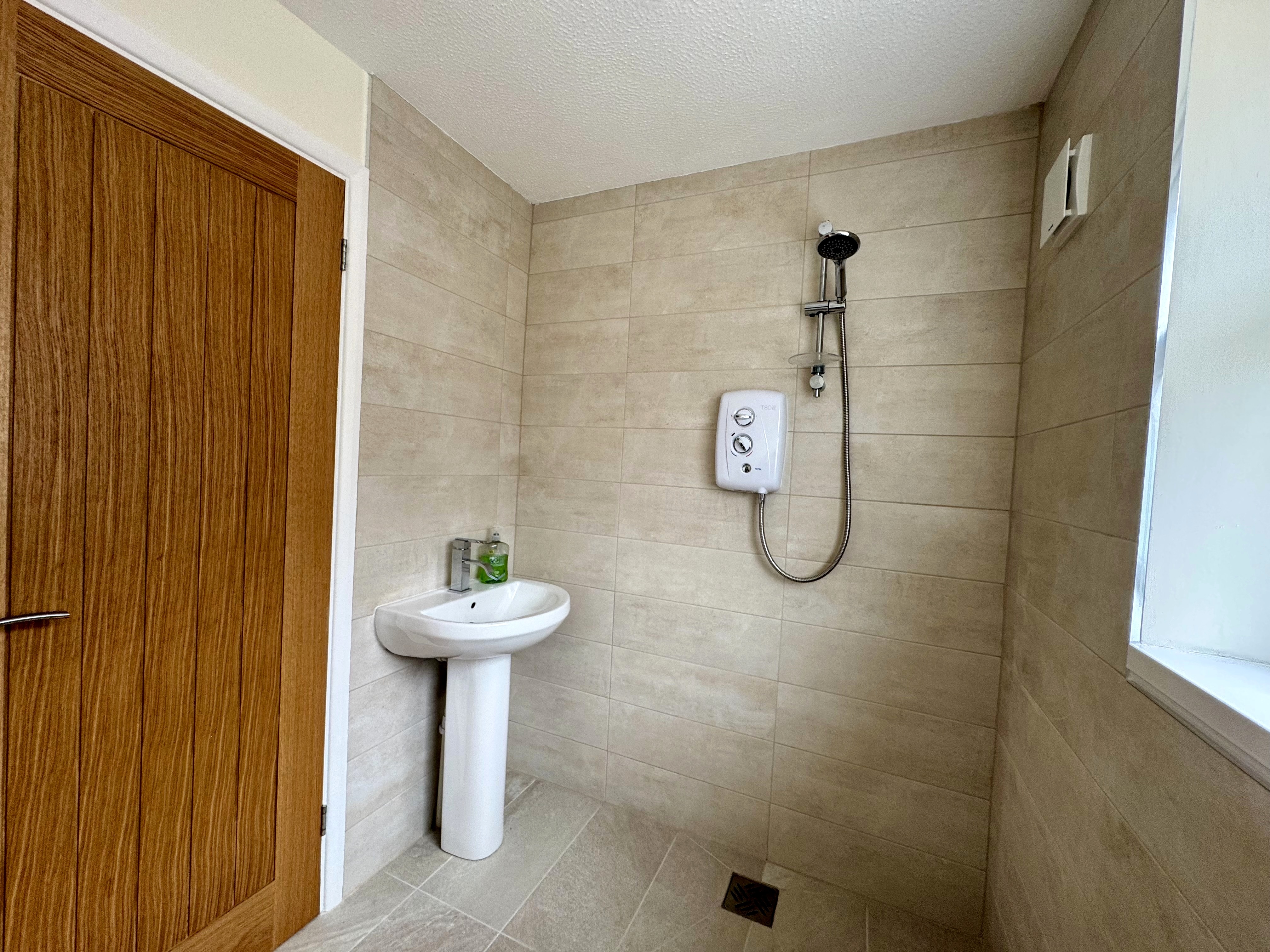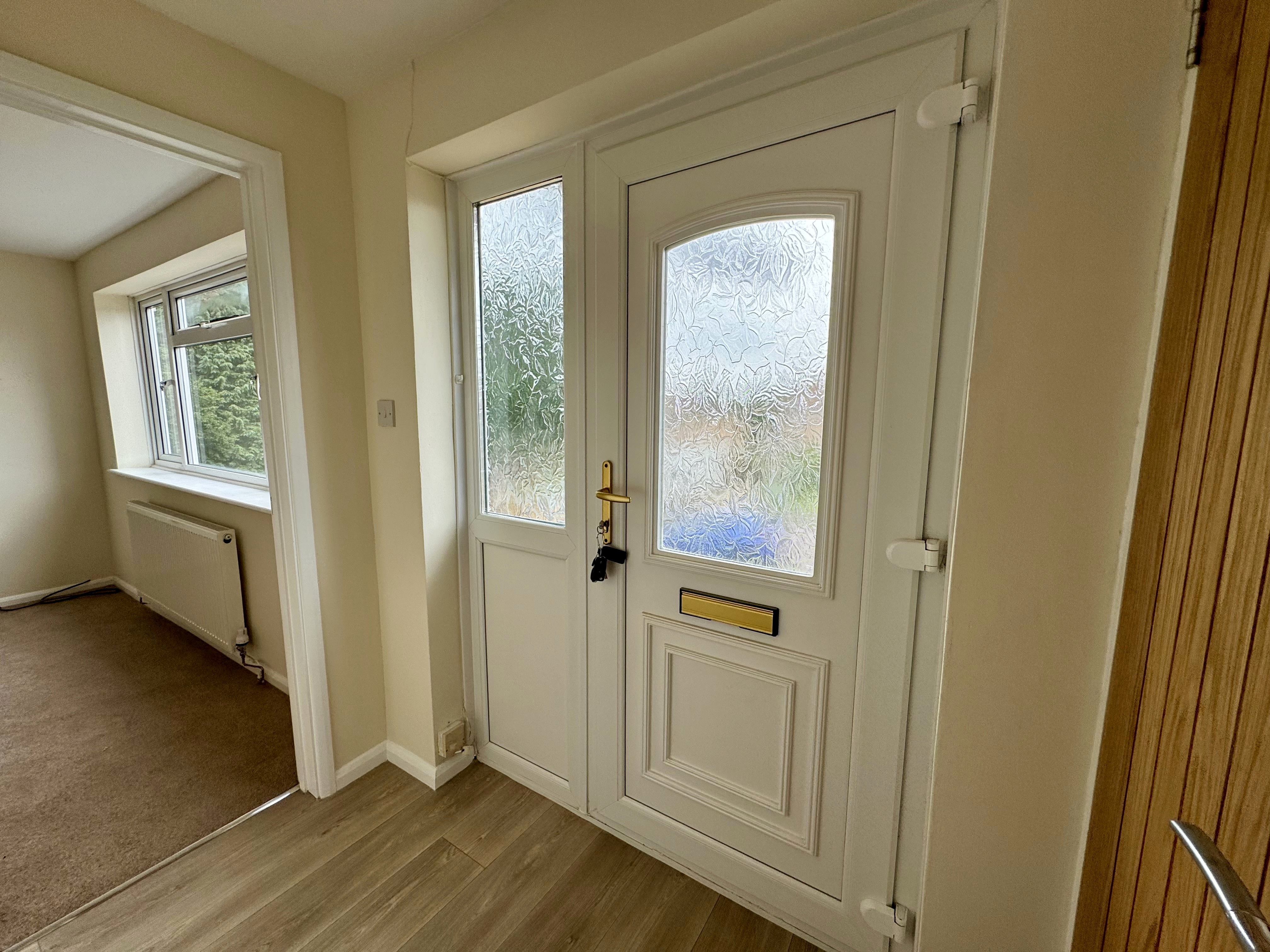 The entrance hall leads into the heart of the home: a generous lounge alongside a well-appointed, recently fitted kitchen with an integrated fridge freezer, cooker, and hob. Two double bedrooms enjoy views over the generous rear garden, and the property benefits from a recently fitted shower/wet room.